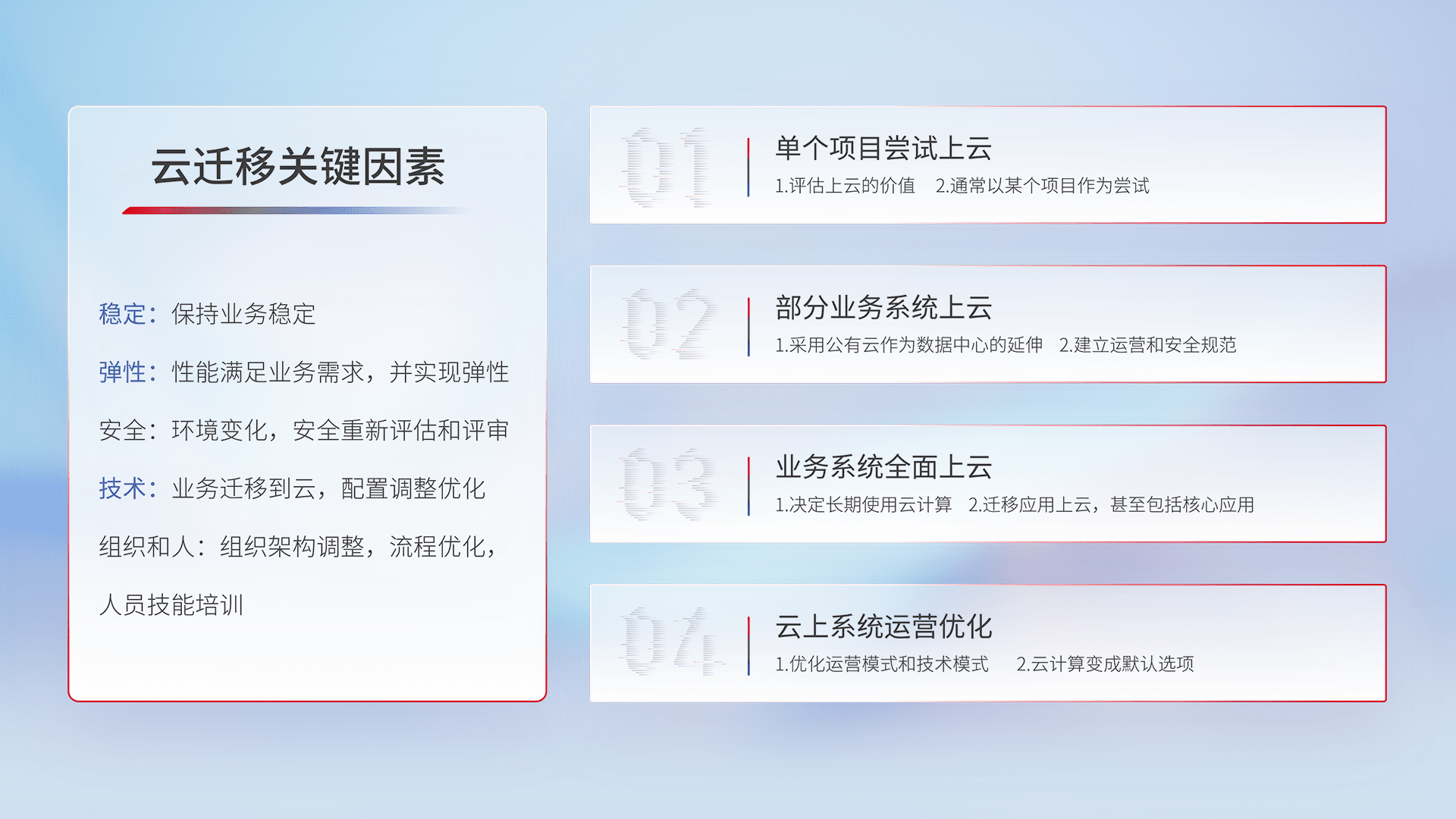 结合实际业务,,,,从规划设计、、、、云平台选型、、、、云原生改造、、、、数据迁移、、、集成交付,,,迁移全过程为客户识别最佳上云路径,,做好风险识别管理,,,,设计网络架构、、身份权限、、、、安全审计合规、、、操作审计、、日志审计、、监控告警策略、、、多站点容灾设计等,,对云上基础设施进行整体规划,,,,提升IT治理水平,,,以满足弹性、、高可用、、高性能的需求。。。